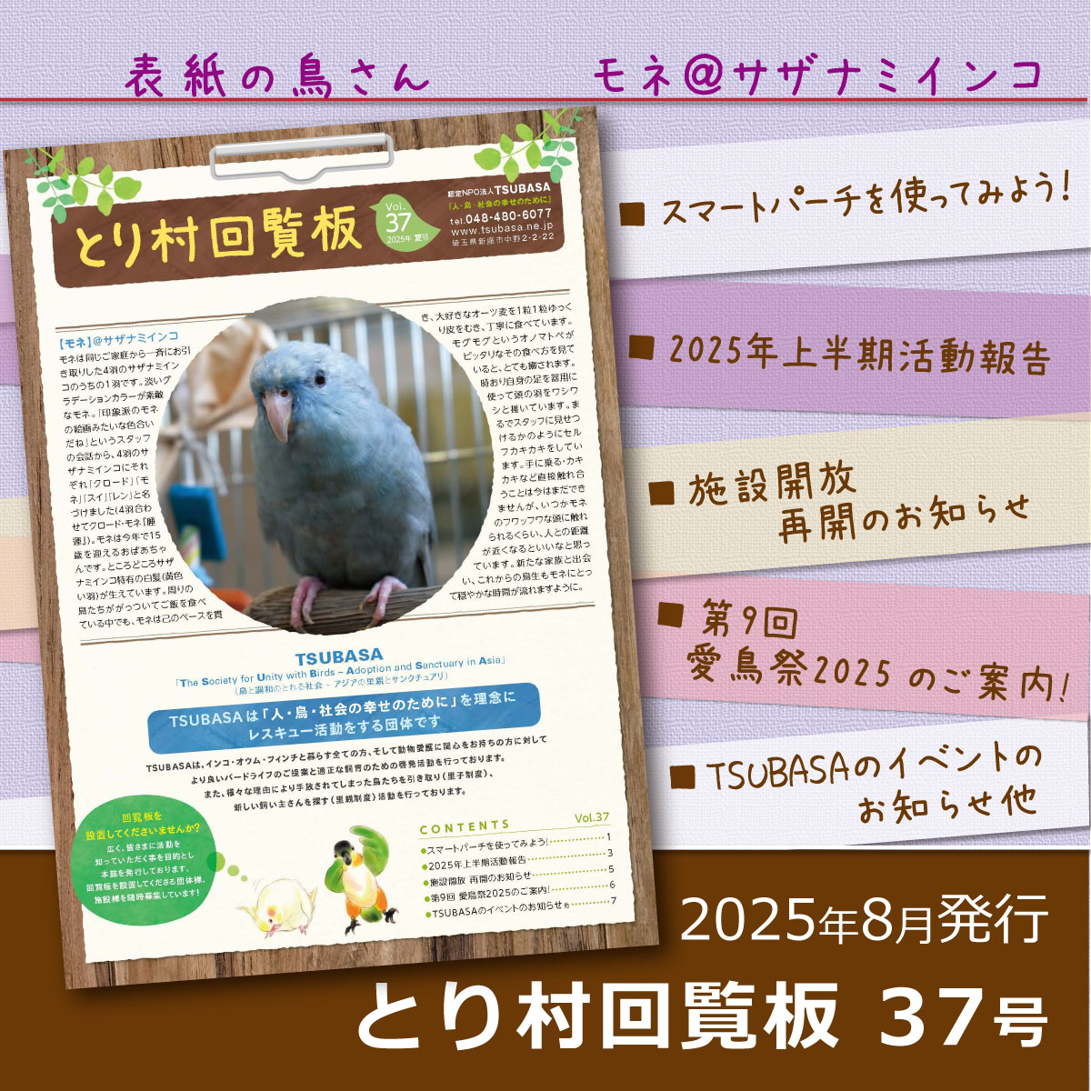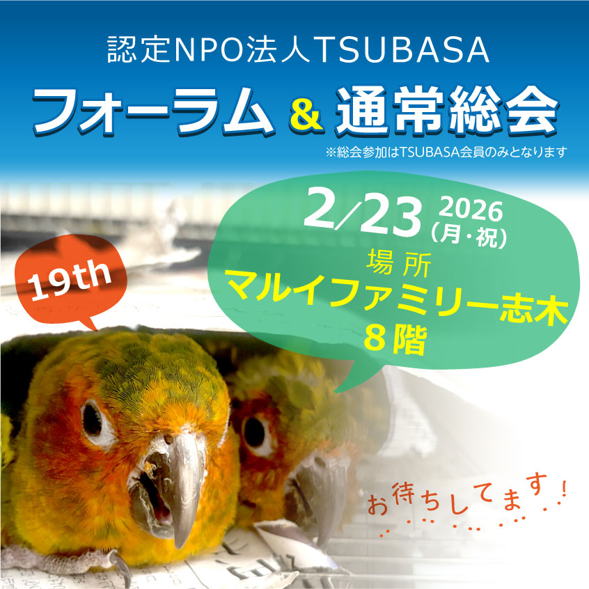 TSUBASAは、飼い鳥(インコ・オウム・フィンチ)を飼えなくなった方から保護すると共に、保護した鳥たちの里親探しや、末永く鳥と人が一緒に暮らすための啓発活動も行っています。