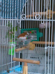 二羽は以前は別々のケージでしたが、放鳥するとお互いに訪問しあっていたので、一緒にしてみたところ、ぴったりとよりそうように…