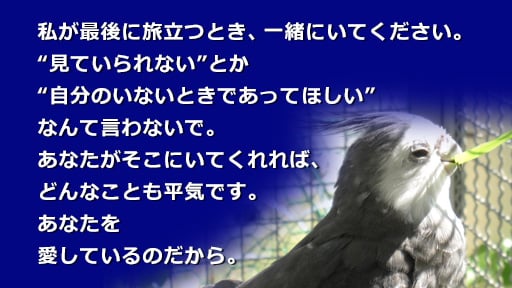 私が最後に旅立つとき、一緒にいてください。“見ていられない”とか“自分のいないときであってほしい”なんて言わないで。あなたがそこにいてくれれば、どんなことも平気です。あなたを愛しているのだから。