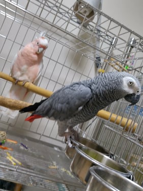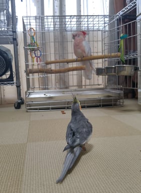 本日は先住のヨウムが、マルちゃんに対する警戒心<<好奇心となりケージの上からちょっかいをかけたり開けた扉の餌入れに座り込んでみたりと一気に距離を詰めて典型的な「空気読めない男」になっていました。