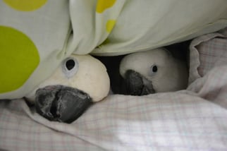 先日、洗濯物を干しに部屋を出た際に2羽でついてきて、置いてあったぼろ布で仲良く遊んでるからとしばらくほっておいたら、干した洗濯物ほとんどを穴だらけにされてしまいました。(゚Д゚)