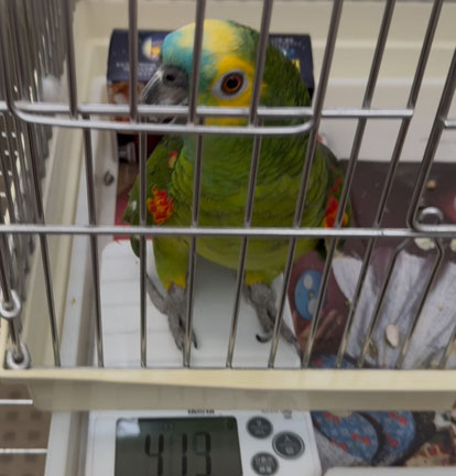 40歳以上と高齢ですが、毛もつやつや真ん丸で真ん丸目目の元気なアオボウシインコの男の子です。「こーたー」、「こうちゃーん」、「かわいっ」などとおしゃべりをよくします。人とは程よい距離感を保つタイプですが、気分がいい時にはたくさんカキカキをさせてくれます。人が前にいって話しかけると、前後左右に揺れて反応します。現在(2025年10月)は練習中ですが、ヒマワリの種を使っての誘導でケージの中でスケールに乗り、体重を測ることができます。メインのごはんがすべてペレットのため、ご褒美の時にもらえるヒマワリがだいすきです。