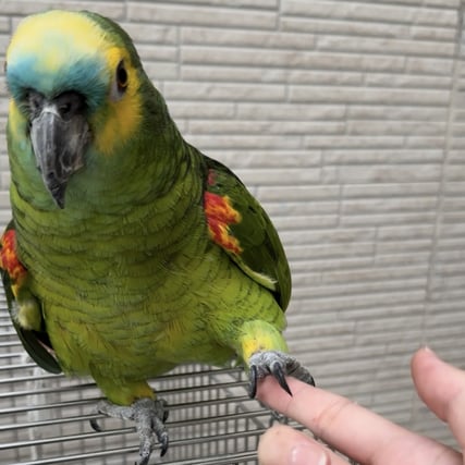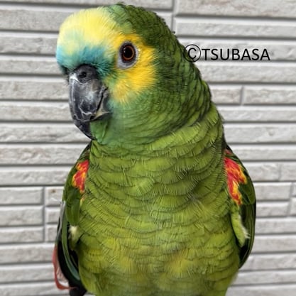 40歳以上と高齢ですが、毛もつやつやで真ん丸目目の元気なアオボウシインコの男の子です。「こーたー」、「こうちゃーん」、「かわいっ」などとおしゃべりをよくします。人とは程よい距離感を保つタイプですが、気分がいい時にはたくさんカキカキをさせてくれます。人が近づいて話しかけると、前後左右に揺れて反応します。現在(2025年10月)は練習中ですが、ヒマワリの種を使って誘導することでケージの中でスケールに乗り、体重を測ることができます。メインのごはんがすべてペレットのため、ご褒美の時にもらえるヒマワリがだいすきです。