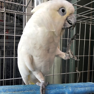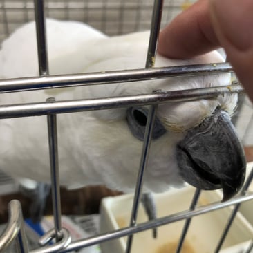 可愛らしいムックですが気難しい一面を持ち、男性よりも女性に厳しい行動を取りやすい傾向にあります。スイッチが入るタイミングを読むことが難しく、特にケージの扉の開閉時には飛びつき・噛みつきに注意が必要です。以前はどのスタッフでも手に乗せて移動ができていたのですが、23年6月現在ごく一部のスタッフを除き手に乗せたり、放鳥スペースへ移動したりすることができません。ケージ越しか否かでガラッと印象が変わる鳥さんです。お迎え前までに複数回の面会が必要になるかと思いますが、ムックのペースに合わせていただけると嬉しいです。